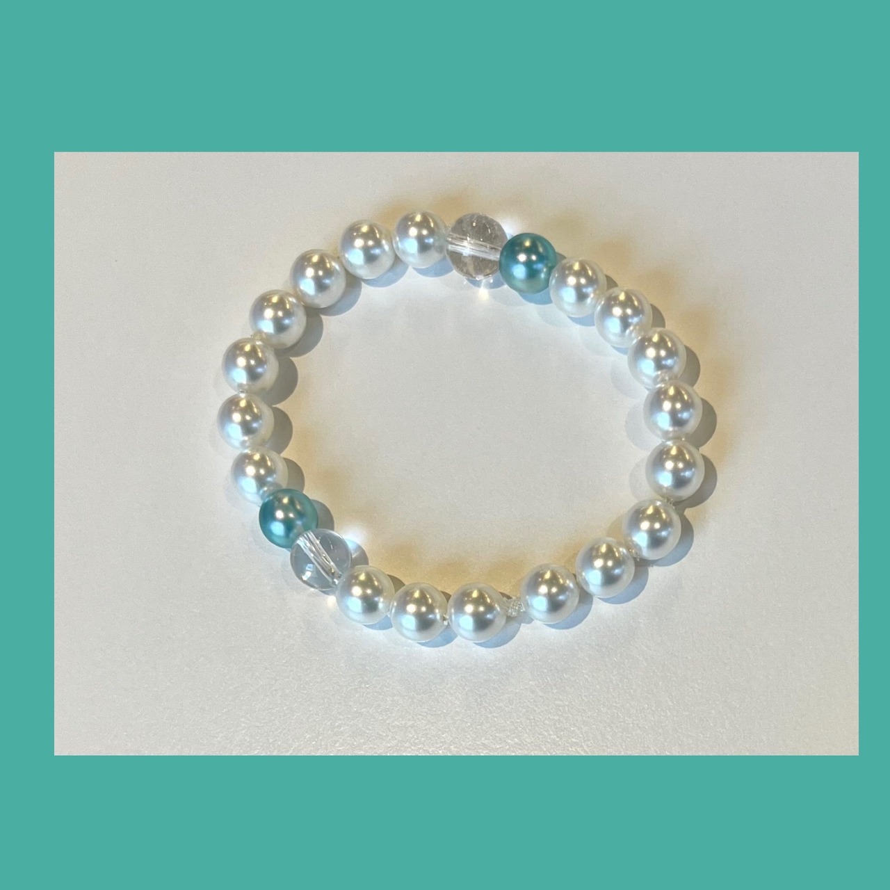 このブレスレットは、厳選された天然水晶と美しい樹脂パールを組み合わせた、洗練されたアクセサリーです!